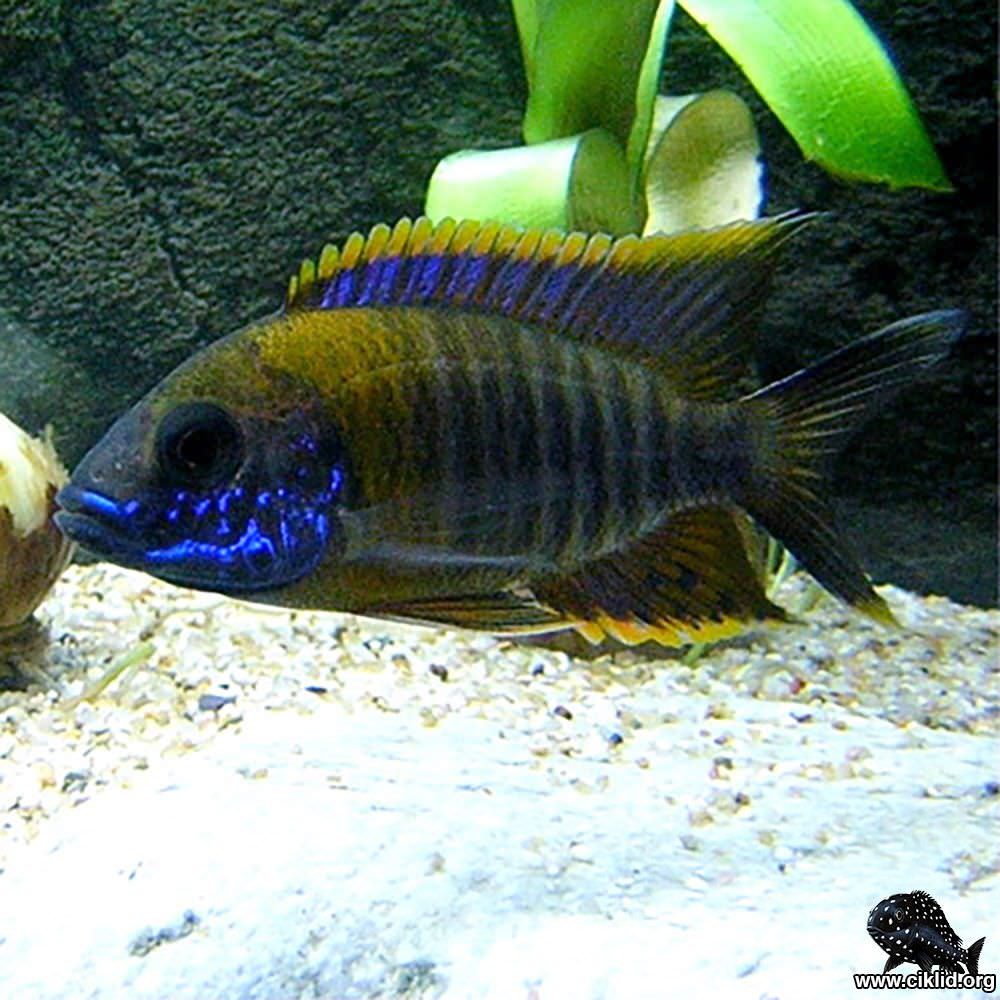 Hanen uppvisar en påtaglig metallblå grundfärg med ett parti bakom huvudet och ner mot buken som går mot brungult. Ryggfenan går i blått med en kraftig gul söm och analfenan har också en gul söm. Honan är silvrig med mörka vertikala band. Hanen blir upp till 12 cm och honan ca. 8 cm.